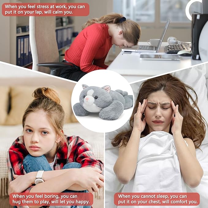 - 【Unevenly Distributed Weights】Provide the more realistic "hugging back" feeling, offers 5lb weight to help calm irritability. Besides, the weight added in abdomen, weighted fore legs and hind legs for the weighted stuffed animals cat as well. This weighted cat plush animal helps manage stress and its body size is great for cuddling. The cute stuffed cat pillow plush will feel heavier in your arms, providing a sense of security and offer comfort for anyone at night or in times of need