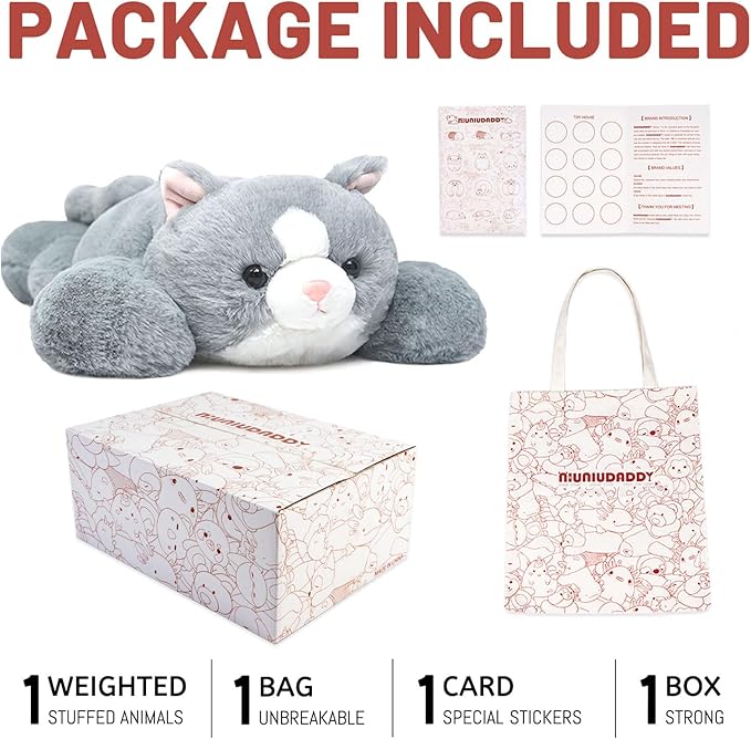 - 【Unique Original Design from NiuniuDaddy】Our designer designed the weighted stuffed animals based on kawaii cat or kitty and also designed the BAG, STICKER, CARD, BOX from NiuniuDaddy. This cute anxiety cat stuffed animals is a great gift for anyone in your life who loves kitty plush or who feels anxiety, uneasy easily and it will surely bring a smile to anyone