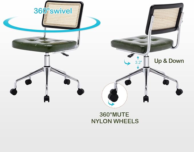 Zesthouse Mid Century Home Office Chair, Armless Desk Chair with Rattan Back, Adjustable Height Task Chair Vanity Chair for Girls Women, Upholstered Swivel Chair, Green Faux Leather