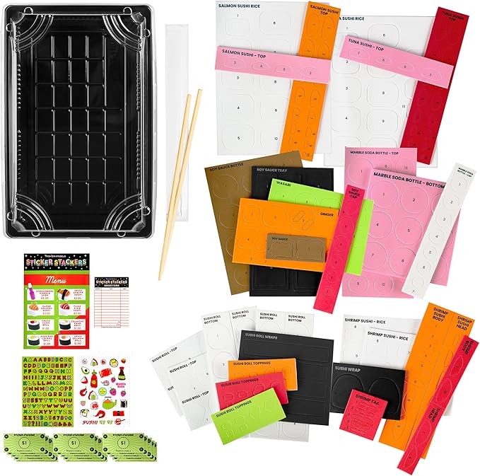 - WHAT'S INCLUDED: Includes 36 foam sticker sheets, 1 sushi container, 1 chopsticks set & sleeve, 1 order form pad, 1 menu, 15 sheets of play money, 3 sticker sheets, 1 sheet of double-sided glue dots & 1 collector sheet. Designed in the USA for ages 6+