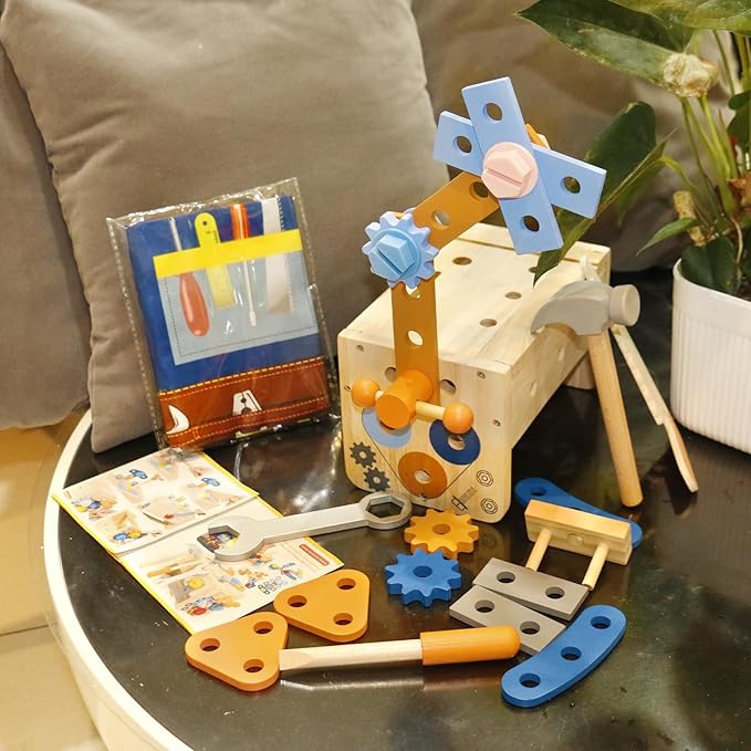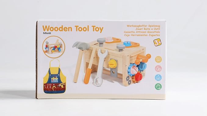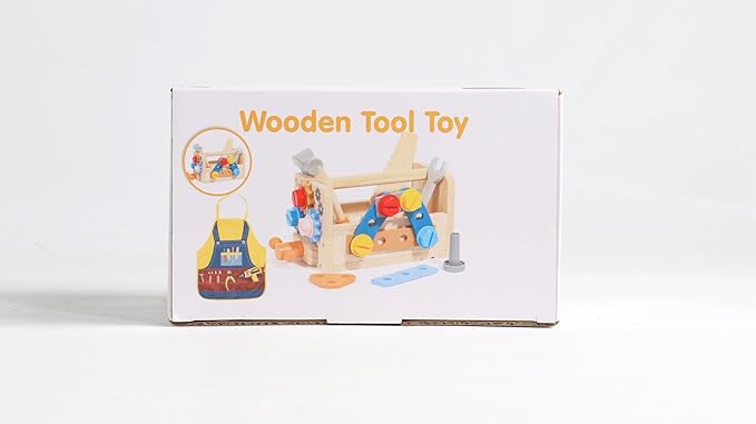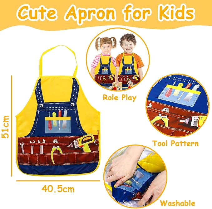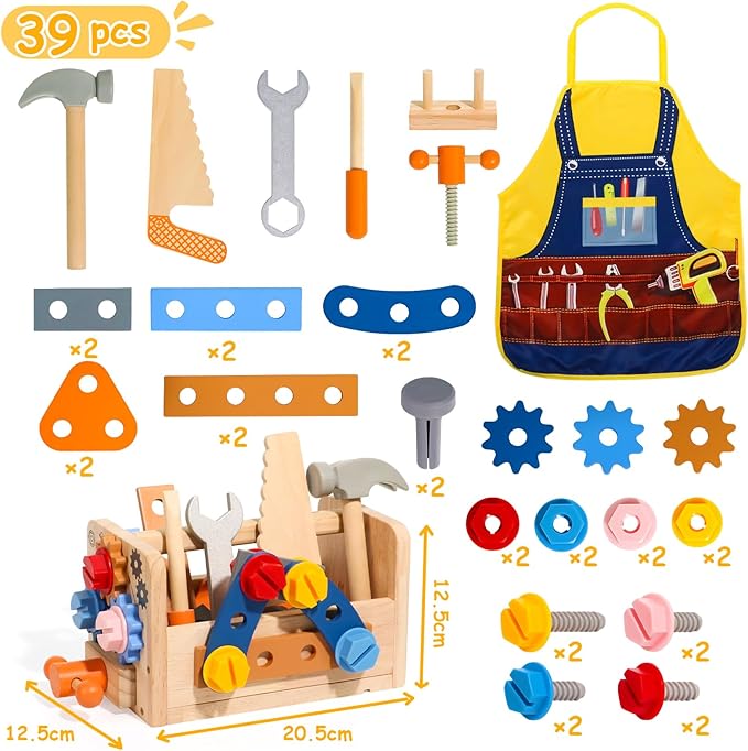 - Toddler Tool Set with Tool Pattern Apron: Unique tool pattern apron for this pretend play tool set. Your little one could become a little carpenter with his/her own apron. 39PCS tool set for toddlers includes a wooden workbench, hammer, screwdriver, wood saws, wrench, handle, wooden block, gears, screws, nails, hex nuts and other small accessories. Perfect 2 3 year old boy toys. Please note that the pocket of the apron are fake and can not hold anything