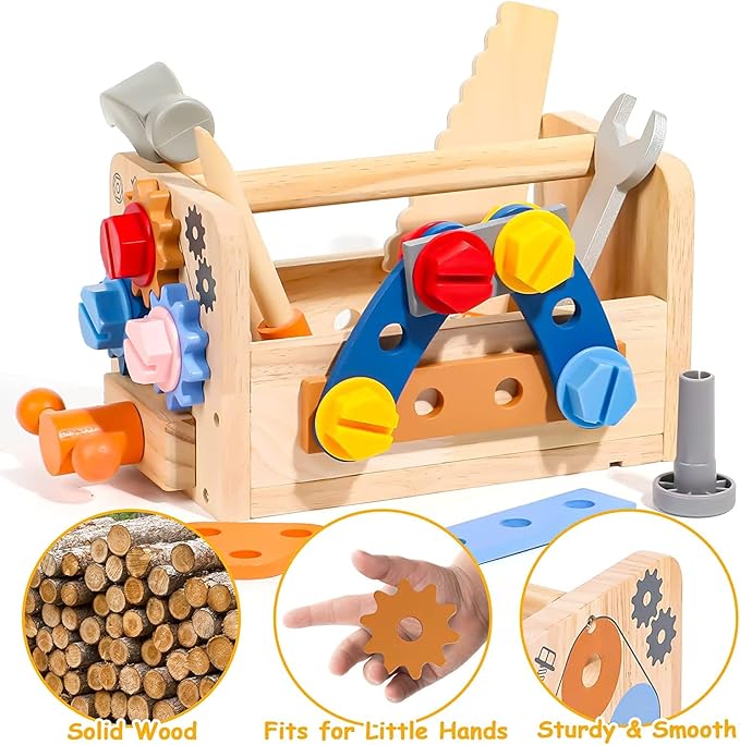 - STEM Montessori Toys for 2+ Year Old: With multiple pretend toy tools, toddlers can play the role of carpenters or engineers more safely. Using the hammer for pounding and prying nails, a mini wooden saw for sawing, a screwdriver for twisting screws, a wrench for Tightening or loosening nuts. Children can learn how to use tools during play, which is beneficial for exercising their fine motor skills, hand-eye coordination skills, and promoting brain development