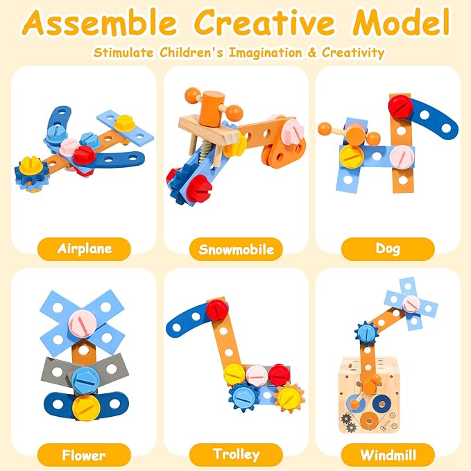 - Educational Construction Toddler Toys: Plenty of accessories allow your kids and to create different models with you. Screws and nuts are especially made of plastic, which is easier to tighten than wood for little ones, and durable for longer use. It's a good way to develop kids' hands-on ability and enrich their imagination. The size of the tool bench/tool box is 8.1 inch x 5 inch x 5 inch. Suitable for toddler little hands