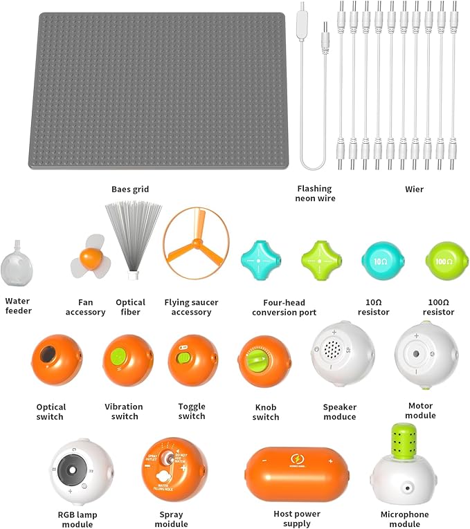 - Circuit Toy: This educational scientific suit includes the bottom plate, powered host, spray module, mike module, RGB light module, speaker module etc. This complete electrical toy good for kids experiment and explore elementary electrical simple circuits