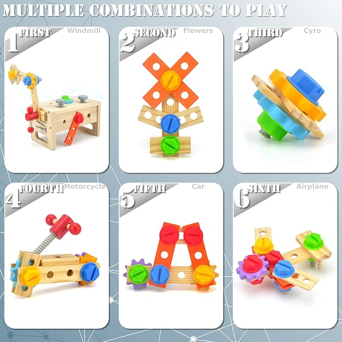 - 【Educational Pretend Play Tool Toys】The wooden toy tools for kids can be put together into a variety of interesting shapes, such as windmills, scooters, airplanes, flowers and small cars. The wooden tool kit also can be used as a kids tool bench, storage box and suitcase for children. Encourages children to organize toys into storage boxes after playing with toys, improving children's storage and management capabilities.
