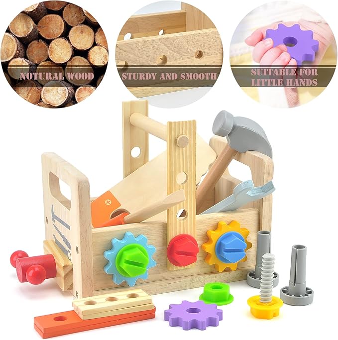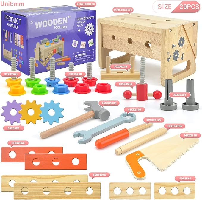 - 【STEM & Montessori Toy】The bright colors of all the parts of this wooden toolbox make it more attractive to toddlers. A wide range of simulated wooden tools designed for children enhances the realism and allows children to give full play to their creativity. Perfect Montessori learning material for color or shape recognition, imagination, fine motor skills and intelligence training.
