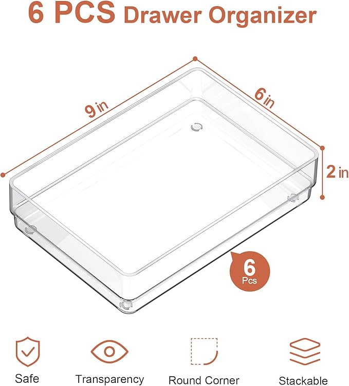 - Large Capacity: A set includes 6 pcs large size plastic drawer organizers 9" x 6" x 2" (6 Packs) for storing more and larger items. You can customize combinations to store stuff and organize drawers to your specific needs. Convenient to use in your daily life, and make everything look neater and more organized.
