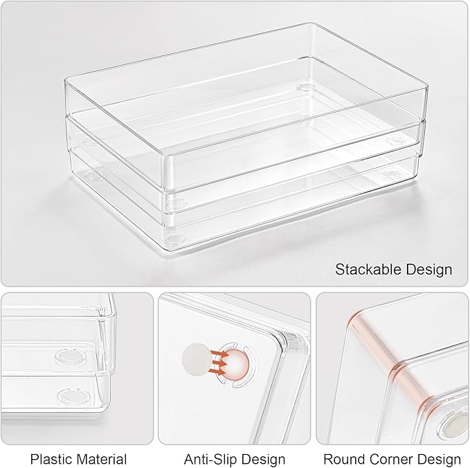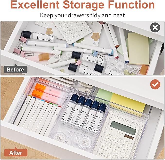- Space Saving and Stackable Trays: Stackable drawer organizers can be stacked and sorted out in your space easily. Clear drawer organizers can save you time to organize and find your stuff, it’s easy to find and use your items in the drawer, keep your space neat, and help you get a neat lifestyle and enjoy more.