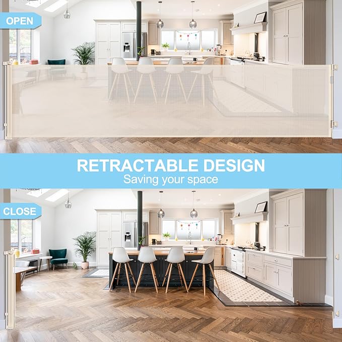 - [120" Extra Wide & Retractable Design] Extra wide retractable baby gates can be extended up to 120 inches wide and 35 inches tall. Mesh can be completely retracted away when not in use.