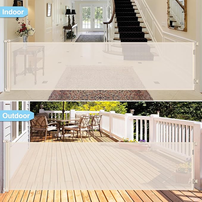 - [Perfect Fit Indoor and Outdoor] retractable dog gate can be installed at bottom of stairways, doorways, hallways, deck, porch indoor and outdoor.