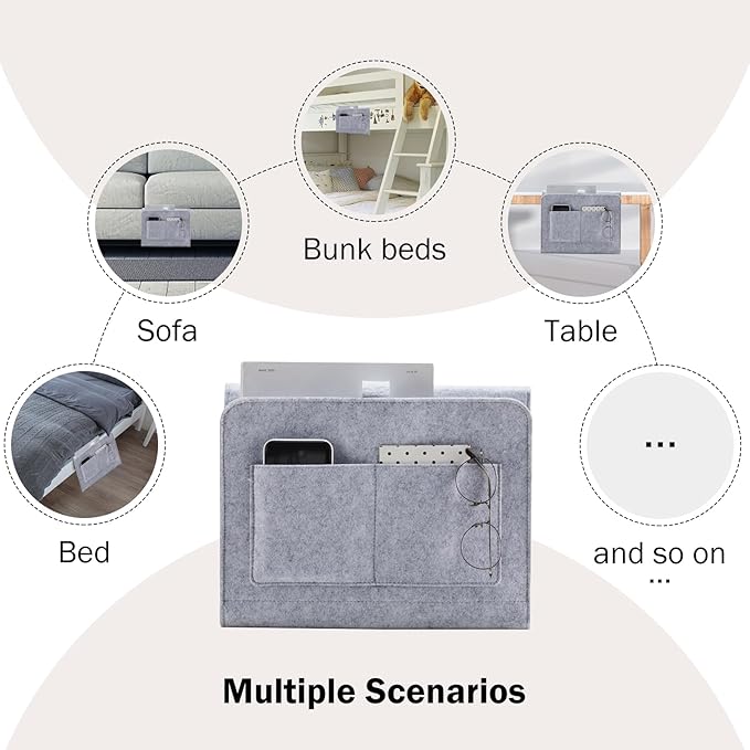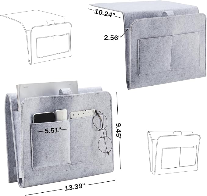 - Convenient Design:Nothing is more frustrating than not being able to locate a bedside remote control, our bedside caddy offers a practical solution to this problem. It is incredibly convenient to use and can hold various items such as books, phones, glasses, iPad, and more, making them easily accessible for reading. With two exterior pockets and two small mesh pockets on the inside, it provides flexible storage space.