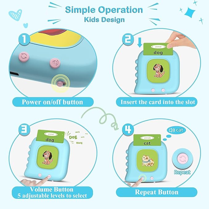 - 【Learning Toys for Toddlers 1-3】Toddler flash cards been upgraded the speech more clearly and native English, the cards is thicker. Turn on the switch, insert the card into the card slot, a key cycle function, you can repeatedly read and learn, no need to insert the card again. Talking flash cards for toddler is a fantastic learning resources for children aged 1 to 6 years old.The sight words flash cards kindergarten is a good choice for preschool parents to teach their children how to read.