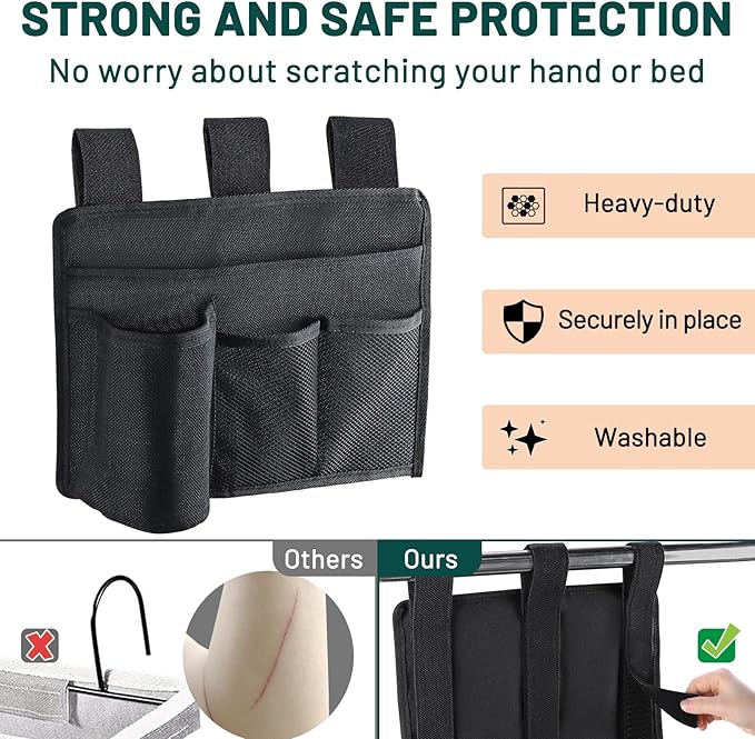 - 【Keeps Everything Within Reach】Store all of your personal items at hand by the bedside with this ultimate bedside caddy. Create extra storage that won't take up room on your bedside table; No assembly required. Just open the magic stickers and put them on your bed brace and stick the strips. Just attach them on to any headboard or bed rail, press firmly to ensure a secure hold.