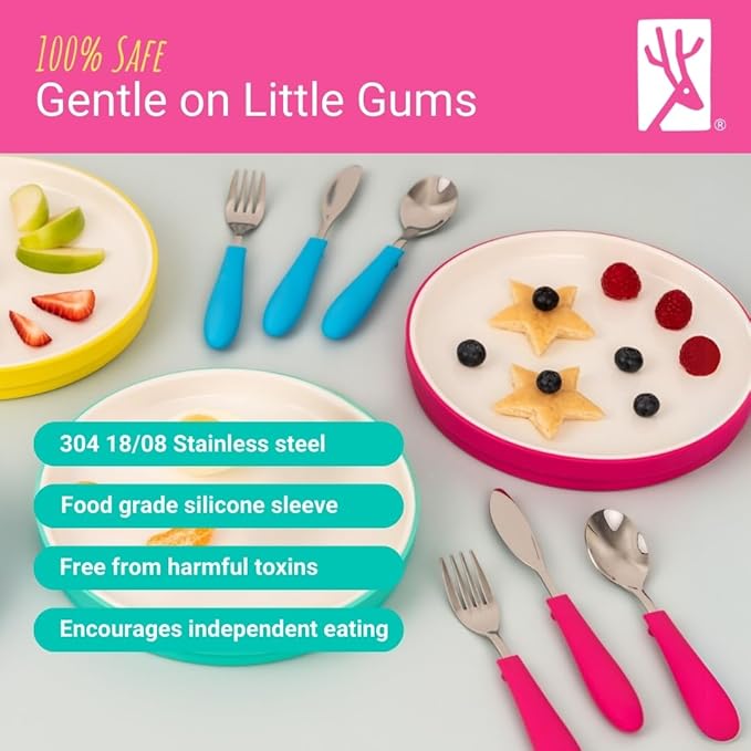 • SILICONE HANDLE: The Elk and Friends spoon, fork and knife feature a stainless steel tip and a easy to grip ergonomic anti-slip silicone handle making it easy for small hands to hold.