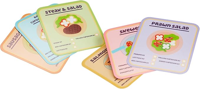 • GRILL GRIN – Whether your little chef is cooking up a delicious Sausage Sizzle or a healthy Prawn Salad, the 6 recipe cards make it easy to follow the ingredients included in each dish and provides a fun matching game.