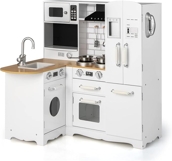 - 【Deluxe Corner Kitchen Playset】Combined with a microwave oven, an induction cooker, a kitchen sink & faucet, an integrated stove, a dish washer, a fridge with ice dispenser, and a cupboard, the pretend toy creates a corner play kitchen for kids to play with friends or parents!