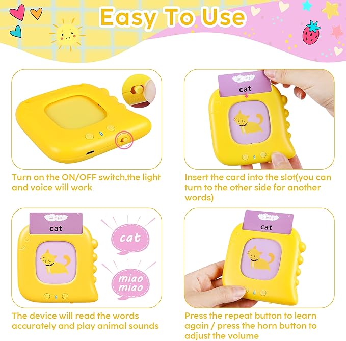 - Easy to Use: Turn on the switch, put the card into the card slot, the card reader will pronounce the words. A key cycle function, you can repeatedly read and learn, no need to insert the card again.