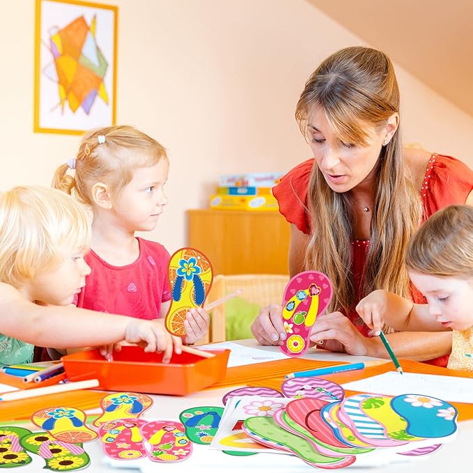 - Enjoy DIY Fun: play flip flop craft kits activities can exercise kid's creativity and imagination and fine motor skills, allow them to learn something while enjoying handicrafts fun, children will be excited when creating some fantastic ideas about this art craft project, make their own flip flops with these simple and fun card and sticker activities