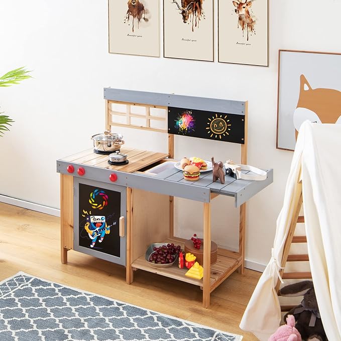- 【Solid Fir Wood Material】Made of natural fir wood and well crafted, this mud kitchen for kids outdoor is built to last, high-strength and deformation resistant. Whether placed indoors or outdoors, it will stand the test of time. Thick support legs improve stability and load-bearing capacity. Certified by ASTM and CPSIA, this mud kitchen set promises safe and reliable use.
