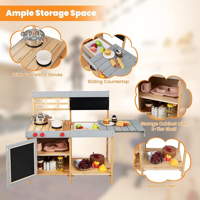 - 【Ample Storage Space】This kids outdoor kitchen is designed with plenty of space for kids to cook, including a wide top with 2 stoves and a sliding countertop. There is also sufficient storage space consisting of a storage cabinet with 2-tier shelf and a bottom shelf, which helps to organize all the toys after play and keep the top clutter-free.