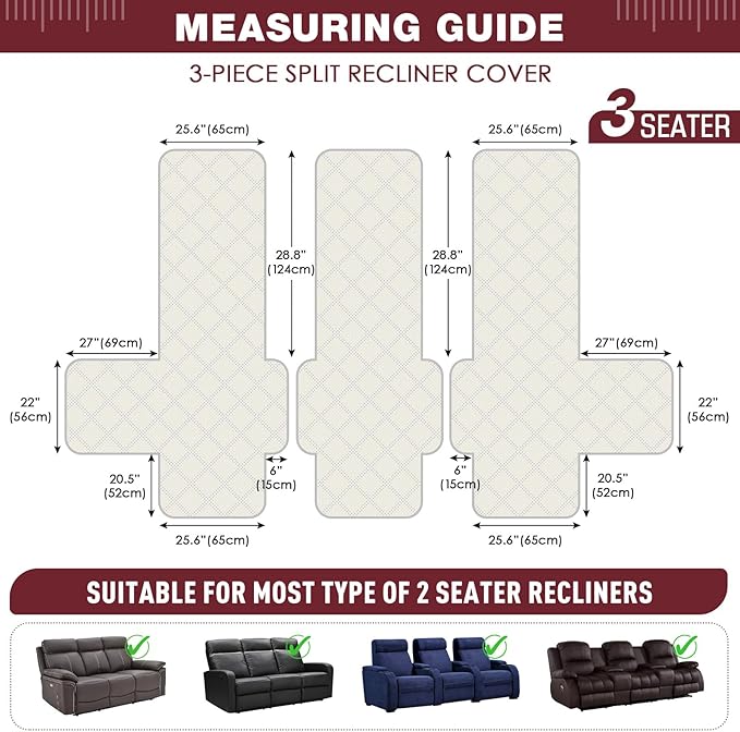 - 【3 SEATER RECLINING FIT】Our 3 seater sofa cover is designed to fit 3 seater reclining sofas, made with 3 seperate pieces , perfectly fit 76.8 inch reclining 3 seater couches. For more details, please refer to the measurement guide in the photo, please measure before purchase