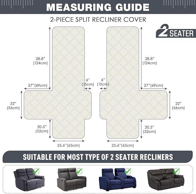 - 【2 SEATER RECLINING FIT】Our 2 seater recliner loveseat cover is designed to fit 2 seater love seat sofas, made with 2 seperate pieces , perfectly fit 51.2 inch reclining 2 seater sofas. For more details, please refer to the measurement guide in the photo, please measure before purchase