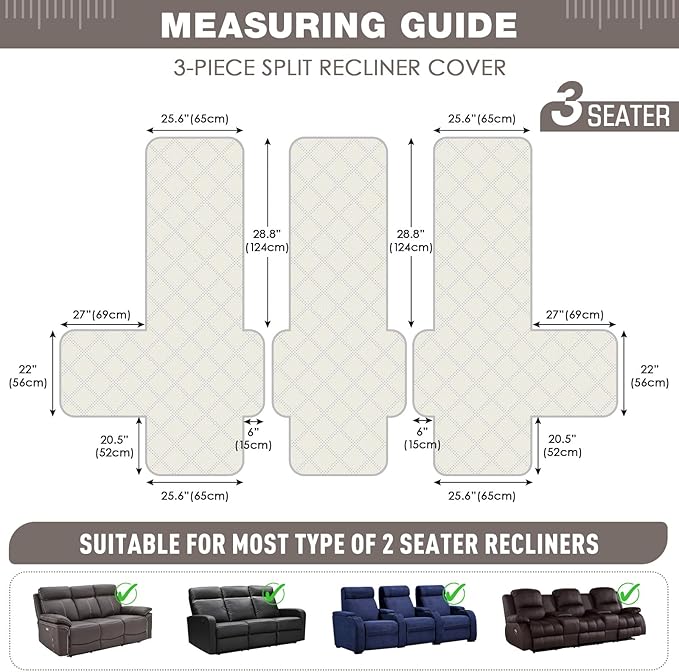 - 【3 SEATER RECLINING FIT】Our 3 seater sofa cover is designed to fit 3 seater reclining sofas, made with 3 seperate pieces , perfectly fit 76.8 inch reclining 3 seater couches. For more details, please refer to the measurement guide in the photo, please measure before purchase