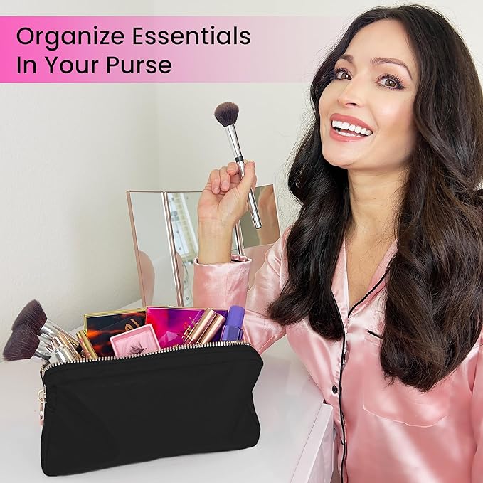 - PREMIUM QUALITY: The small makeup bag for purse is made of premium nylon material with a luxurious gold zipper pouches.