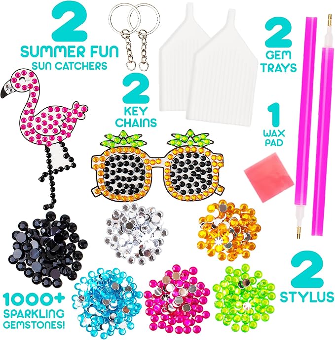 - π¦ πͺπππ§'π¦ ππ‘ π§ππ πππ§: Our Diamond Art Kits for Girls & Boys include over 1500 multicolored gems, 12 colorful gem art stickers, 2 large suncatchers, 2 keychains, 2 styluses, 2 suction cups, 2 gem trays, 1 wax pad, manual, and tracing guides. Perfect for kids' arts and crafts, this kit provides everything needed for hours of creative fun and imaginative play.