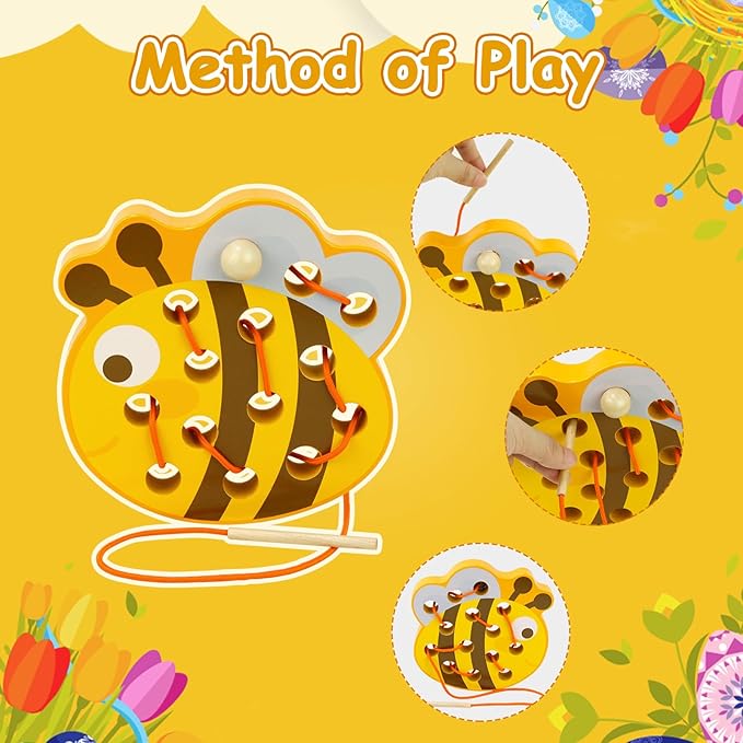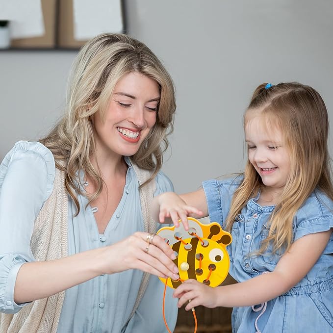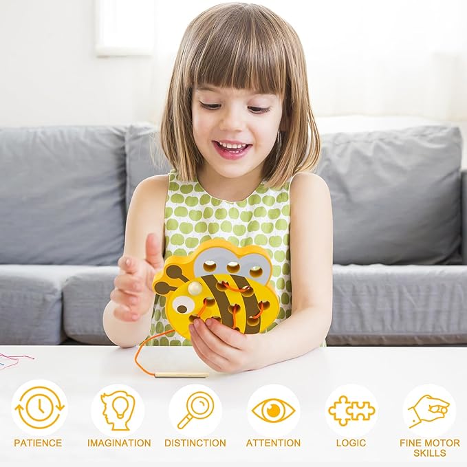 Sealive Wooden Lacing Toys for Toddlers - Fun and Educational Threading Set | Develop Fine Motor Skills | Durable Montessori Toy for Travel (Bee)
