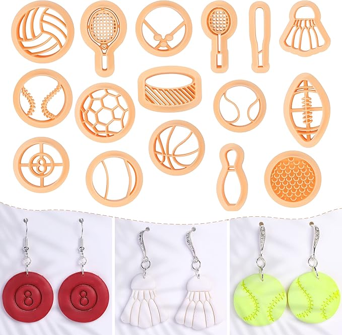 Puocaon Sports Polymer Clay Cutters - 16 Shapes Clay Cutters for Jewelry Making, Sports Theme Clay Earring Cutters, Tennis Badminton Billiards Clay Cutters, Plentiful Sports Clay Jewelry Cutters Set