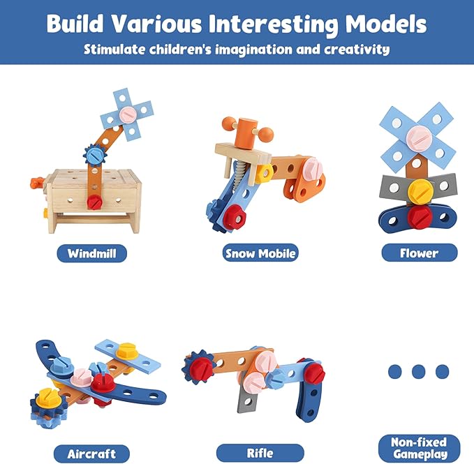 - 【Assemble Multiple Interesting Models】 In addition to the windmill, snow mobile, flower, aircraft and rifle, little ones can use their imagination and creativity to build other fun models with the tool set for toddlers. Let your child's imagination run wild with our amazing toy tool set and see where their creativity takes them!