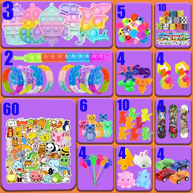 - 【120 Pack Fidget Party Favors for Kids】This party favors pack include 3 pop fidget toys keychain, 2 pop bracelets, 10 slap bracelets, 10 dinosaur whistles, 60 animal stickers, 5 bouncy balls, 4 sticky hand toys, 6 tumbler toys, 4 pull back cars, 4 mochi squishy toys, 4 mini skateboards, 4 finger spinner, 4 puzzle balls. Total 120pcs pinata stuffers toys to keep kids' attention, foster creativity, and improve finger dexterity.