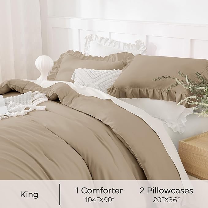 - 【3 Pieces Taupe Comforter Set】Available in ruffle comforter king: 1 ruffled comforter (104x90Inch), 2 pillowcases (20×36Inch); Great gift idea for all your loved ones on special occasions; surprise your friends and family members with this ruffle comforter sets.