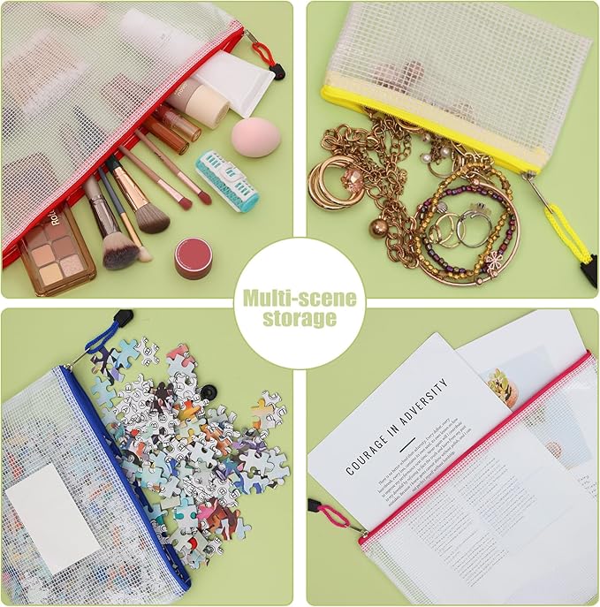 - [Multiple sizes]: Multi-size mesh zippered storage pockets can be used to store document and office supplies. Some sizes can be used to store travel items such as toothbrushes and jewelry. Some can be used to store toys and DIY gadgets.