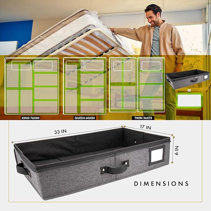 - 𝟑𝟎𝟎𝐃 𝐂𝐚𝐭𝐢𝐨𝐧𝐢𝐜 𝐂𝐥𝐨𝐭𝐡 𝐌𝐚𝐭𝐞𝐫𝐢𝐚𝐥: Made from premium quality fabric, our 33x17x6" Under Bed Storage Containers With Lids are durable, sturdy, & carefully designed to hold large quantities of clothes, blankets, shoes, & various bed accessories. These under bed storage dorm drawers are designed to fit perfectly under your bed for efficient bed room organization and storage, making it an under bed organizer that will easily blend into your home's aesthetic style.
