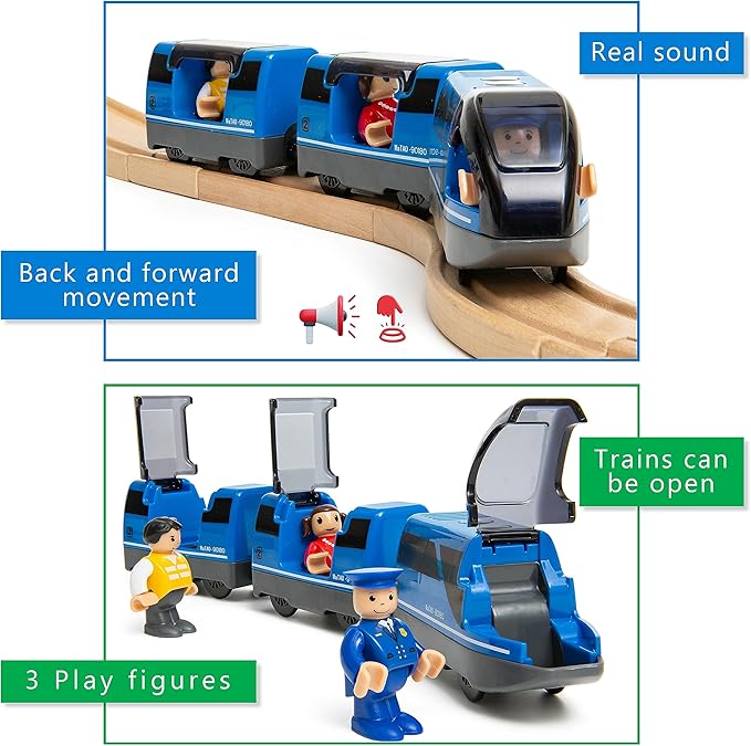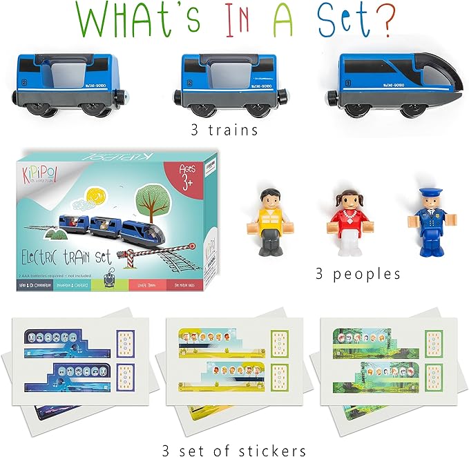 - INGNITE YOUR CHILD'S IMAGINATION: The KipiPol Electric Train Set goes beyond a simple train toy. It includes a locomotive with buttons for forward, stop, and reverse functions, along with realistic sound effects for a lifelike experience. The set also features two passenger trains with functioning glass doors, three flexible action figures that can sit and stand, and three sets of stickers, allowing kids to personalize and design their own unique trains for kids. 2*AAA batteries required (not i