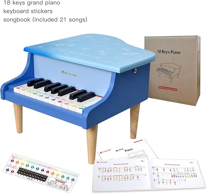 - A Complete Musical Instrument Set: Included:18 Keys Grand Piano (SIZE: 12.72*14.96*8.66 inches), Piano Keyboard Stickers, Beginner Piano Book.
