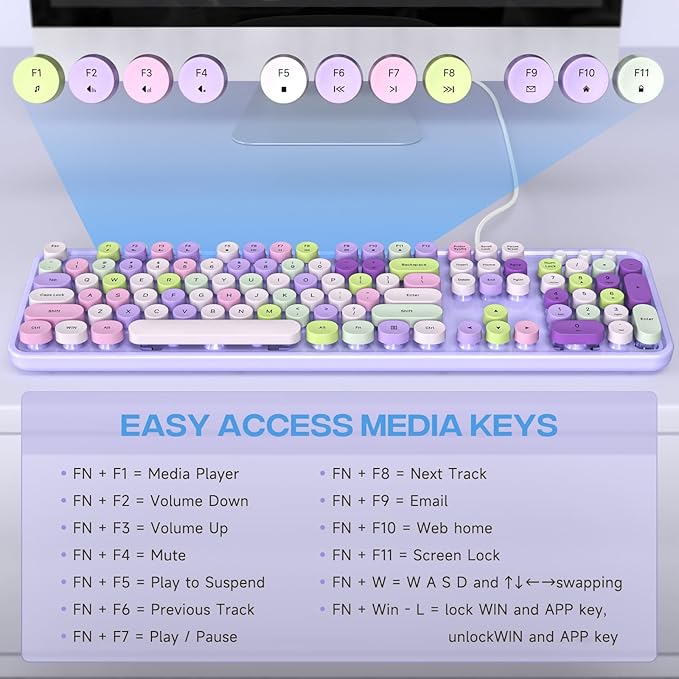 - 12 MULTIMEDIA SHORTCUTS- The wired keyboard has 12 multimedia shortcuts combinations that is convenient to instant access music, volume, computer, mail, etc. it can improve work efficiency greatly. There are caps lock Indicator and number lock Indicator In the upper right corner of the keyboard. (Note: Some multimedia function are not available with Mac OS)
