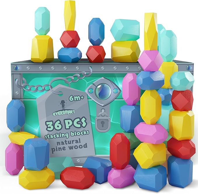 Wooden Stacking Blocks – Montessori Toys for 1 2 3 4 5 6 Year Old Toddlers and Kids, No Choking Hazard – Building Rocks Stones Games, for Girls and Boys