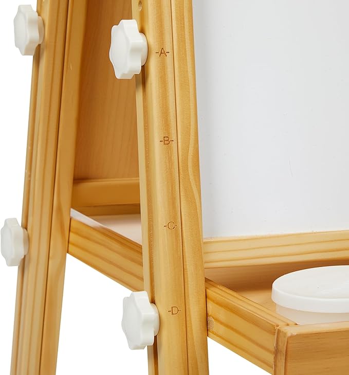 - WOOD EASEL: Made to be stable and robust for a younger child. Wood is varnished for easy cleaning and longevity.