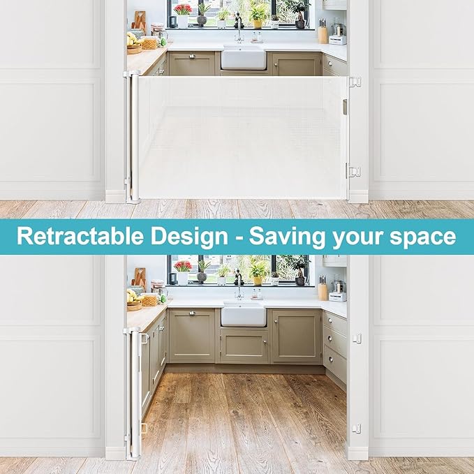 - Suitable for Babies and Dogs : retractable mesh gate Works as both a retractable baby gate and a retractable puppy gate to providing a safe environment to play. Retractable Baby gates can be used indoors and outdoors, such as kitchens, living rooms, doorways, bottom of stairs, decks, porches, patios etc.