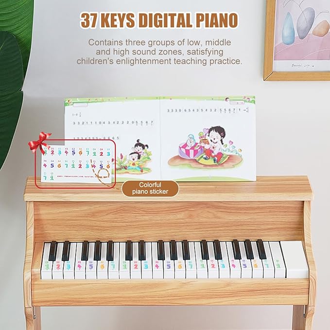 Wooden Kids Piano, 37 Keys Toddler Piano Music Educational Instrument Toy with Music Stand, Color Coded keyboard Stickers, Multiple Sounds and Record Playback, Gift for 3 4 5 6 7 8 9Years Old