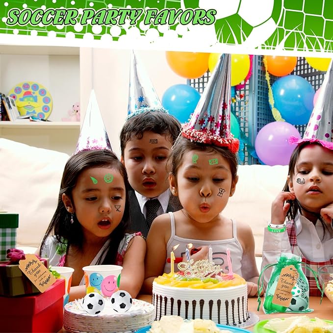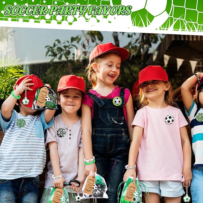- Soccer Party Favors: there are a total of 266 pcs of soccer birthday party favors in the package, including 24 soccer silicone bracelets with 3 colors, 24 whistles with 2 different colors, 24 soccer keychains, 24 soccer stress balls, 24 soccer erasers, 24 organza bags with 3 colors, 24 thank you tags, 24 soccer badges, 24 stamps and 50 sheets of soccer theme stickers