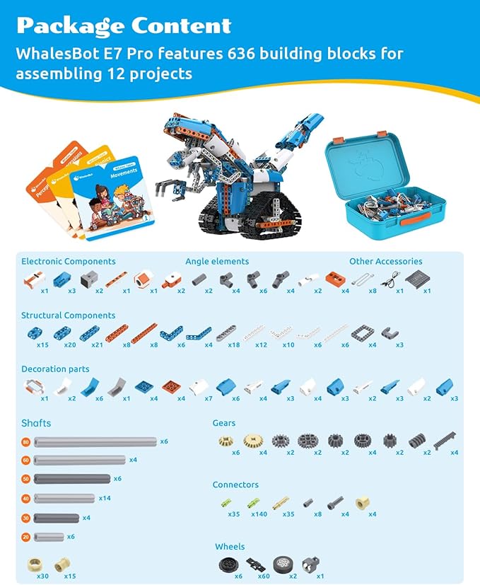 - Early STEM Education & WhalesBot Robot: While coding and playing with WhalesBot E7 Pro coding robot, kids can get well-trained in STEM skills, including engineering/ construction/ programming/ logic, etc. Stem skill can be very important for their whole life.