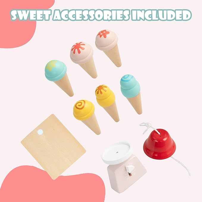 - 🍦【Complete Market Setup】: The vibrant wooden farmer market playset comes with six pretend ice cream toys, food scales, chalkboards, and a charming ring bell. The ample storage space can hold other play kitchen accessories, and the chalkboard can be used to write product names or prices.