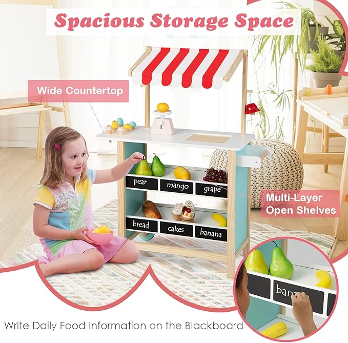 - 🎁【Ideal Gift for Kids】: This classic-looking wooden market stall with its stylish striped canopy is sure to capture the attention of kids. It's a perfect present for any child over 3 years old, whether for a birthday or holiday celebration.