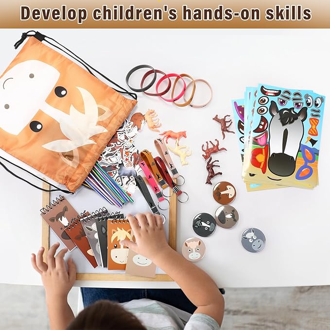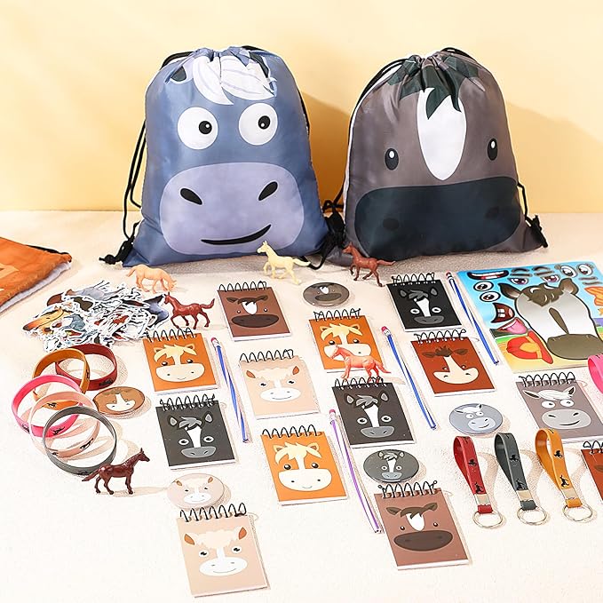 - Horse Party Gift: this package includes 152 pieces of horse party favors for kids, including 12 horse drawstring bags in 6 patterns, 12 horse silicone bracelets in 6 patterns, 12 horse puzzle stickers in 6 patterns, 18 horse notebooks in 6 patterns, 12 horse badges in 6 patterns, 12 keychains in 6 patterns, 12 soft pencils, 12 simulated horses, and 50 horse themed stickers, which are enough to meet your daily use and gift packaging needs; Enjoy a beautiful horse party with friends