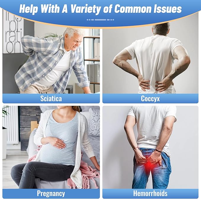 - [Relieve Sedentary Discomfort] Whether you have a desk job or spend long hours sitting, sedentary discomfort is a real issue. Prolonged sitting can lead to a variety of health problems, including lower back pain, hip pressure, and even sciatica. CloudBliss donut pillow is your answer to finding relief from these issues. Its innovative design distributes weight evenly, reducing pressure on the spine and promoting proper posture