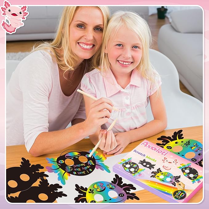 - Exquisite Gift Set:Axolotl scratch cards set includes 30 magical paper masks, as well as 20 wooden sticks and 30 rubber bands, enough for kids to be able to create freely and share the fun time.